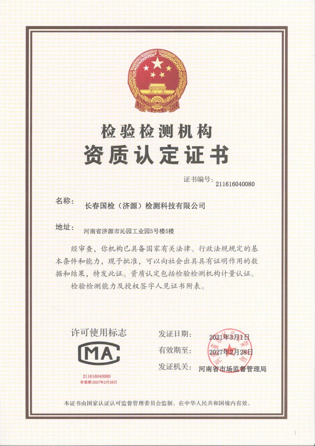 2021年3月1日,河南省市場監(jiān)督管理局向長春國檢(濟源)檢測科技有限公司(以下簡稱“長春國檢濟源公司)核發(fā)了《檢驗檢測機構(gòu)資質(zhì)認定證書(CMA)》。該證書的取得,標志著該公司已具備國家有關(guān)法律、行政法規(guī)規(guī)定的基本條件和能力,可以向社會出具具有證明作用的數(shù)據(jù)和結(jié)果。