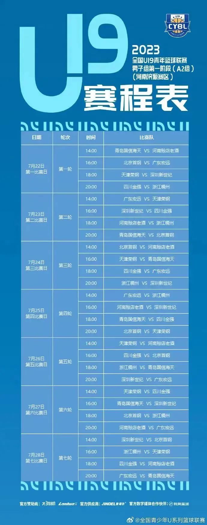 7月22日至28日,2023全國(guó)U19青年籃球聯(lián)賽在集團(tuán)公司所屬籃球城公司體育館如期舉行,為廣大球迷朋友們奉上精彩的賽事,展現(xiàn)競(jìng)技體育魅力!2023全國(guó)U19青年籃球聯(lián)賽男子組第一階段(中原銀行濟(jì)源分行)賽區(qū),有來(lái)自北京、天津、河南、山東、浙江、廣東、深圳、四川的8支球隊(duì)參賽。??