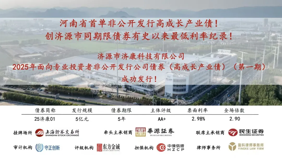 7月30日,濟(jì)源投資集團(tuán)所屬濟(jì)源市濟(jì)康科技有限公司在上海證券交易所成功發(fā)行河南省首單非公開(kāi)發(fā)行高成長(zhǎng)產(chǎn)業(yè)債“25濟(jì)康01”,這是濟(jì)源市濟(jì)康科技有限公司成功斬獲AA+評(píng)級(jí)后,首單5億元高成長(zhǎng)產(chǎn)業(yè)債的驚艷亮相。